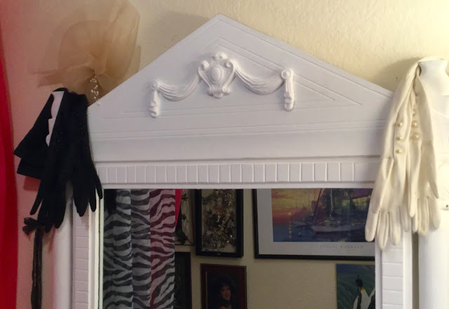 Love this mirror all painted white. I draped a couple of pairs of vintage gloves on the corners.