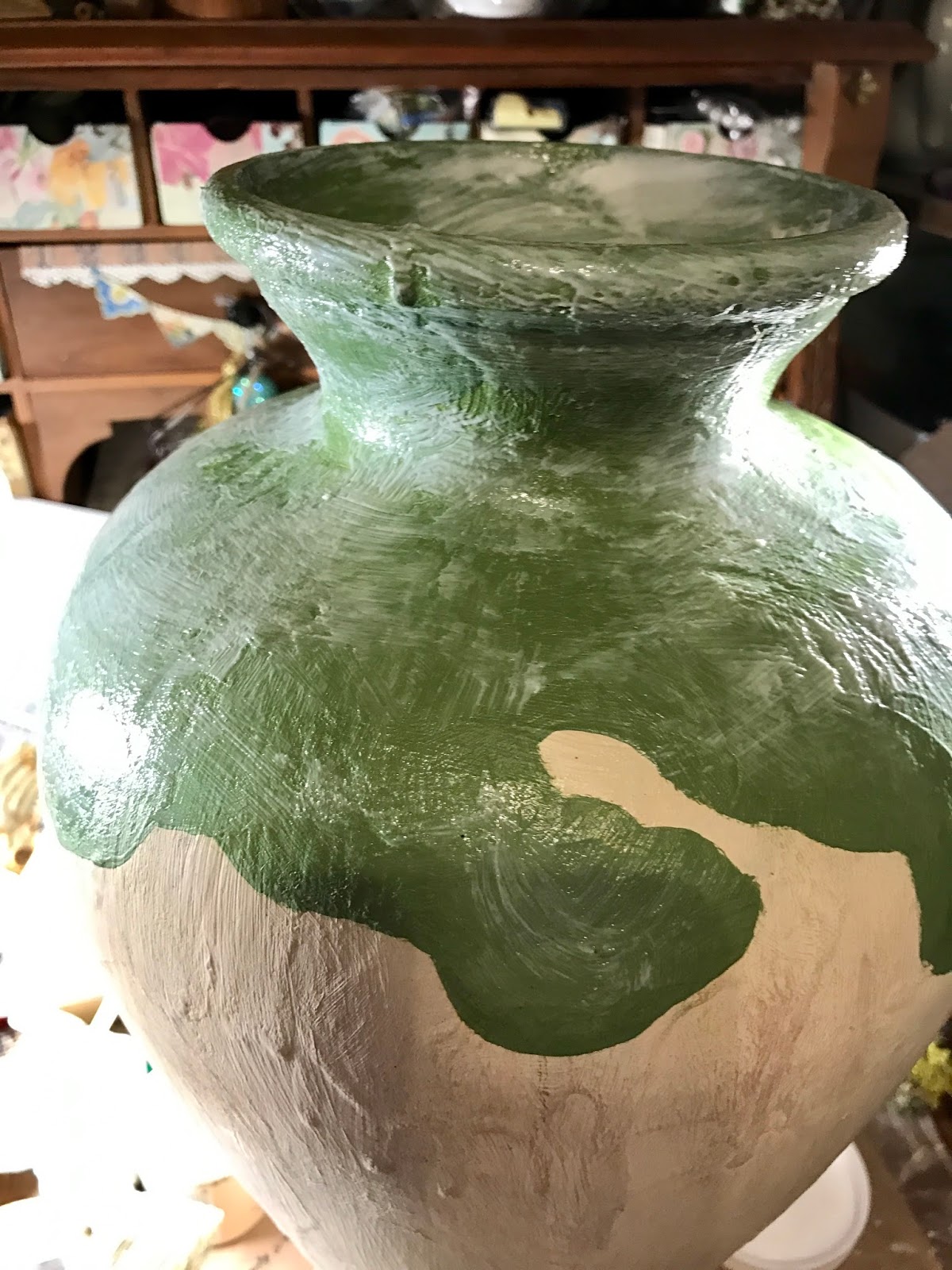 This time I decided to give it the look of a vintage French olive jar. This was a pretty simple makeover. The first thing I did was to coat the entire jar with "Timeless" chalk paint.